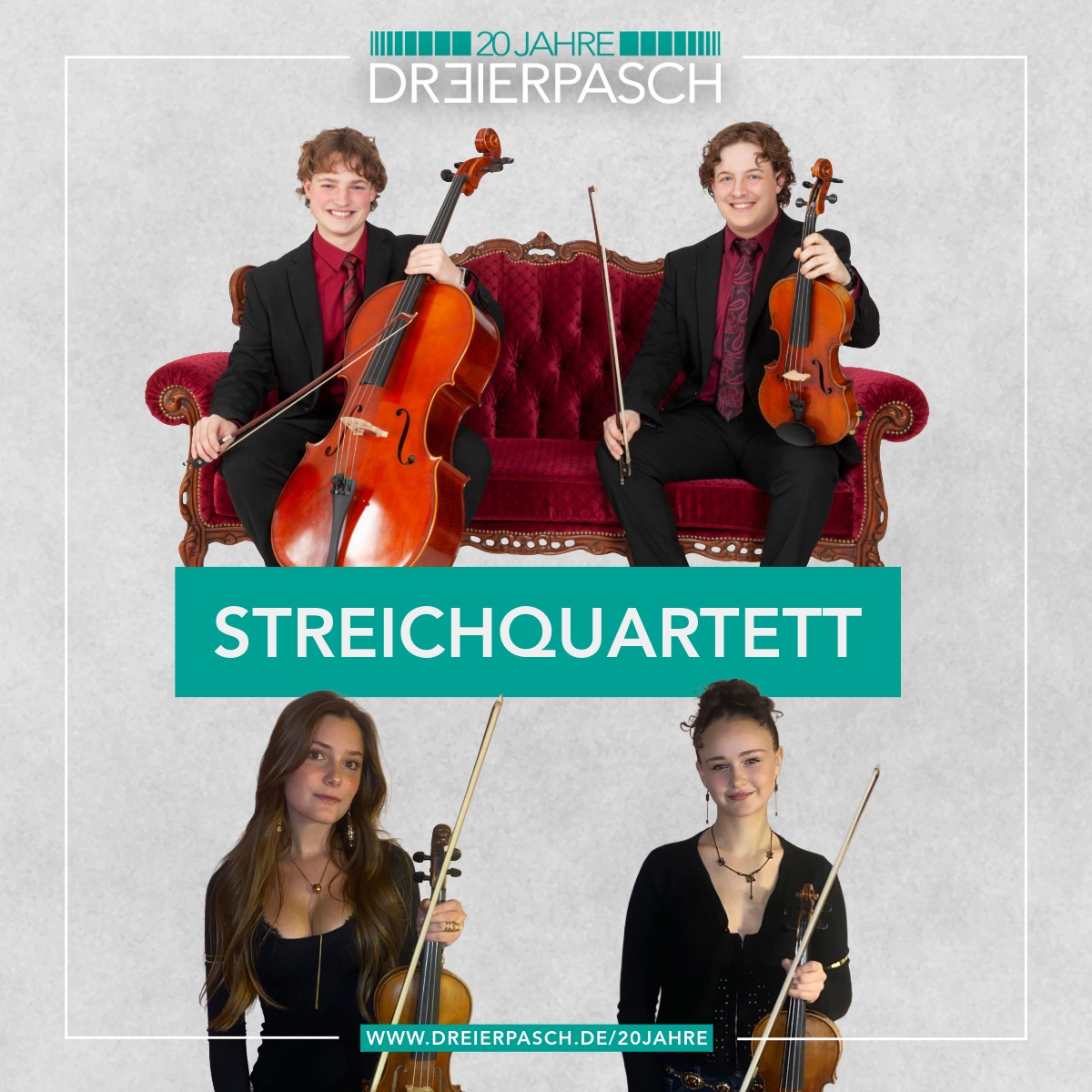Zum 20-jährigen Jubiläum von Dreierpasch bereichert ein eigens zusammengestelltes Streichquartett das musikalische Spektrum des Abends. Die vier jungen Musikerinnen und Musiker überzeugen nicht nur durch ihr außergewöhnliches Talent, sondern teilen mit uns auch eine besondere Verbindung: Wie wir sind sie Absolventinnen und Absolventen des Robert-Schuman-Gymnasiums Saarlouis – einer Schule, die seit jeher musikalische Begabungen fördert und nachhaltig prägt.